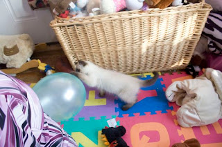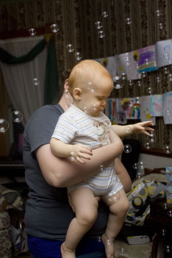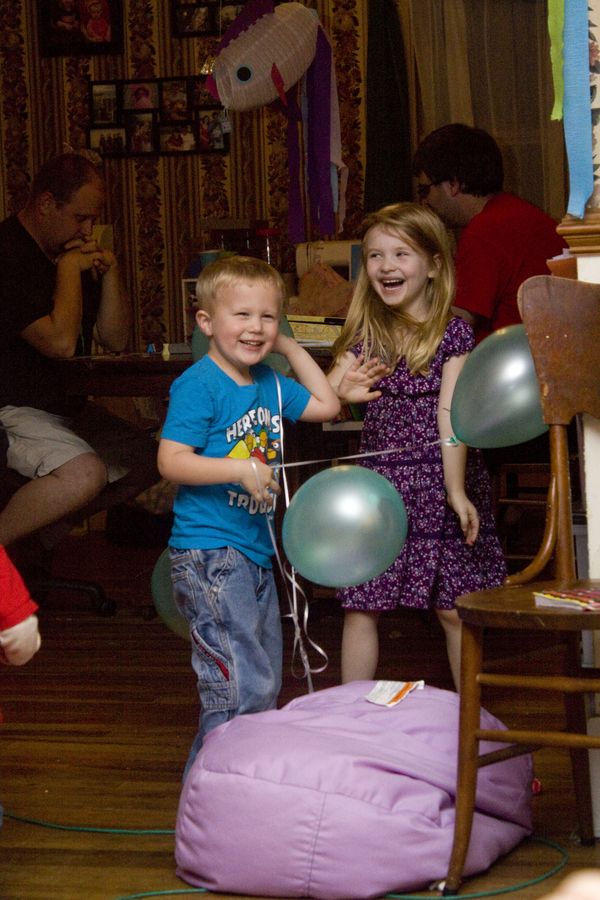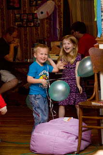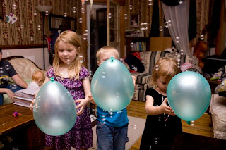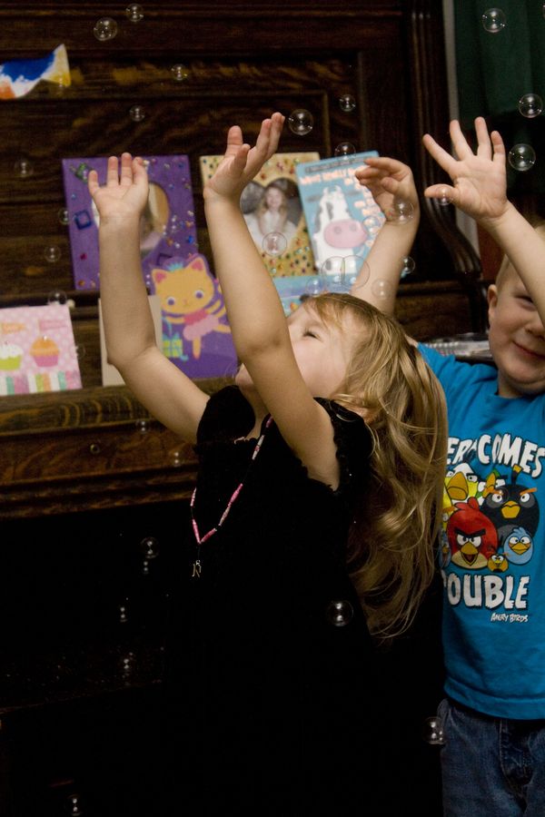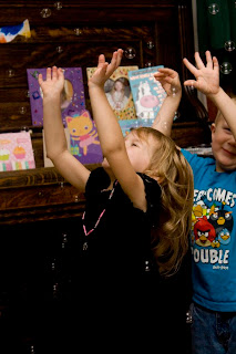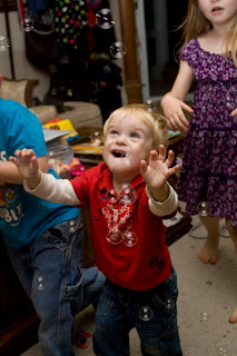I had a bubble machine set up for the girls to play in. They did enjoy it, but we had to turn it off until after the main part of the party. After most of the guests had left I turned it back on for the girls and Stephen. They all had a good time playing in the bubbles. Jasper didn't know what to think of the bubbles, but Eli got in on the action!