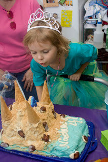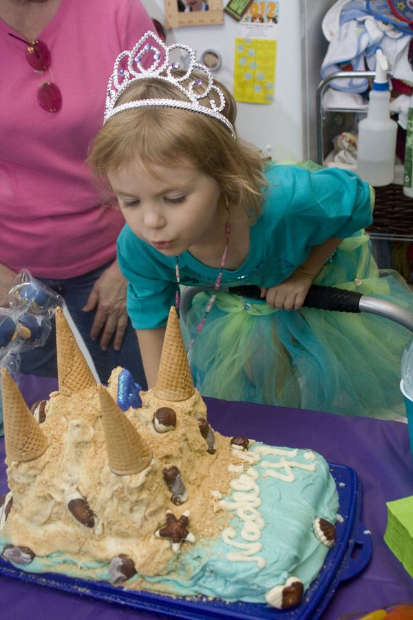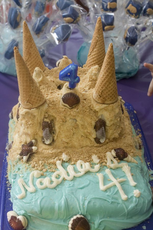 For Nadia's cake I made a sandcastle. I figured I could do it since it wouldn't need to be pretty. I used marshmallow fluff frosting and coated the castle with graham cracker crumbs. Then I added some sugar cones as turrets and some chocolate seashells. I had some Swedish fish on the side.