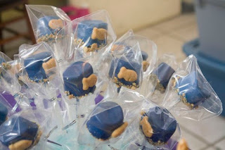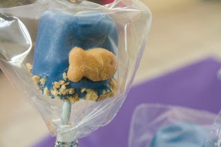 I had also made some chocolate covered marshmallows. I used blue candy melts and added some graham cracker crumbs to the bottom and a little vanilla cupcake flavored goldfish, I tried to do some Oreos as well, but they were much, much harder (I have now learned the tricks of doing covering oreos)! We had a few that made it through the dipping process.