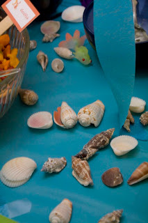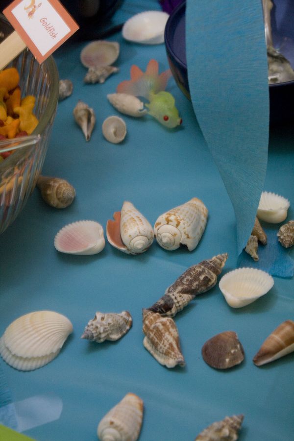 glittery fish up, so we added some balloons and streamers. Then we scattered some shells and glow in the dark fish around.